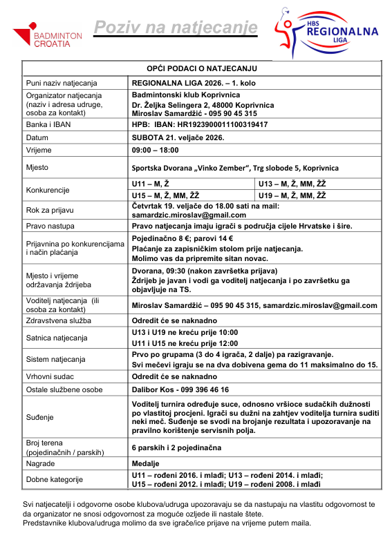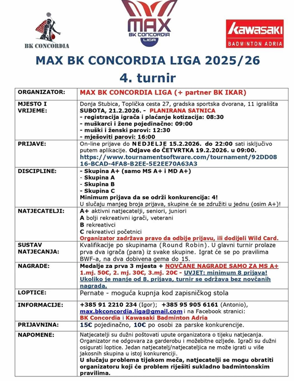Na 4. turniru Max BK Concordia lige u Donjoj Stubici nastupit će naši seniori Siniša Kožuh i Mario Šprišić u C kategoriji muških parova.